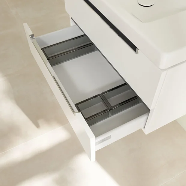 Subway 2.0 bathroom furniture by Villeroy & Boch brings diversity to the cosy bathroom. This Glossy White Wall Hung 2-Drawer Vanity Unit has generous storage space thanks to clever interior arrangement and its shock-absorbing, soft-closing drawers that slows down the drawer and automatically closes it, slowly and silently. With a range of colours, the modern design of the bathroom furniture by Subway 2.0 gives every bathroom a fresh and natural look.